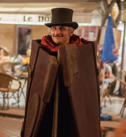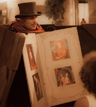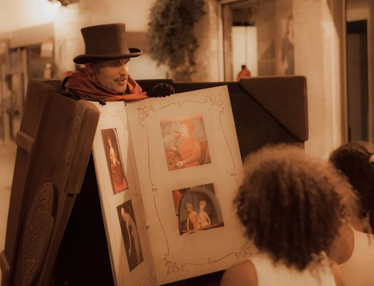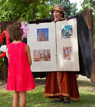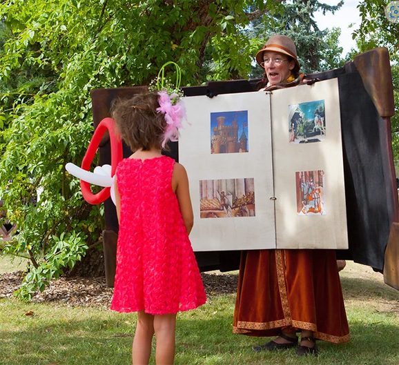 Un comédien transformé en livre vivant fait revivre différents contes pour enfants. Il déambule parmi les invités et s'arrête pour que les enfants puissent tourner les pages et écouter son histoire. Possibilité d'adapter les contes à un thème particulier ou à une tranche d'âge spécifique. 3 passages de 50 minutes.